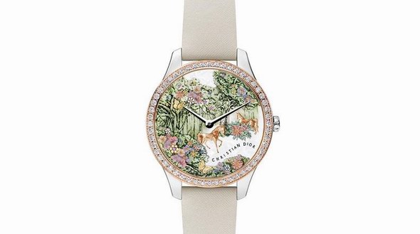 延续Grand Soir系列一贯的风格,DIOR迪奥这次的马年特别款腕表在表盘上描画了骏马在花丛漫步的诗意画面。珍珠母贝表盘上装饰有生机盎然的花园图案,两匹玫瑰金雕刻的骏马游戏其间,同时还有点缀玫瑰金雕刻的蝴蝶和花朵...这款腕表限量发行 30 枚。